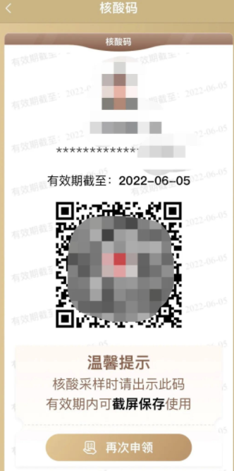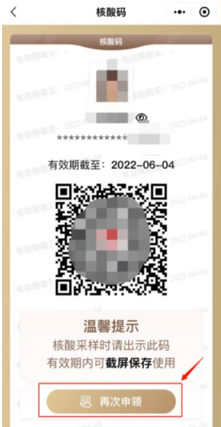 2、若市民小伙伴在有效期内未及时“重新申领”,原“核酸码”将会失效,看法市民小伙伴提前达成“核酸码”的重新申领并截图保存。