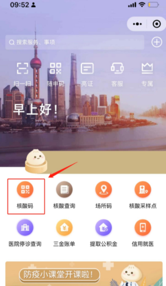 1、从“随申办”app、“随申办”微信小程序或支付宝小程序首页“核酸码”进入