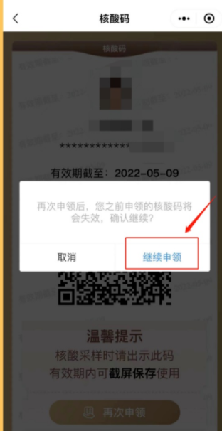 3、“核酸码”页面中点击“再次申领”,再次申领后,之前申领的“核酸码”将会失效,阅读提示后可点击“继续申领”
