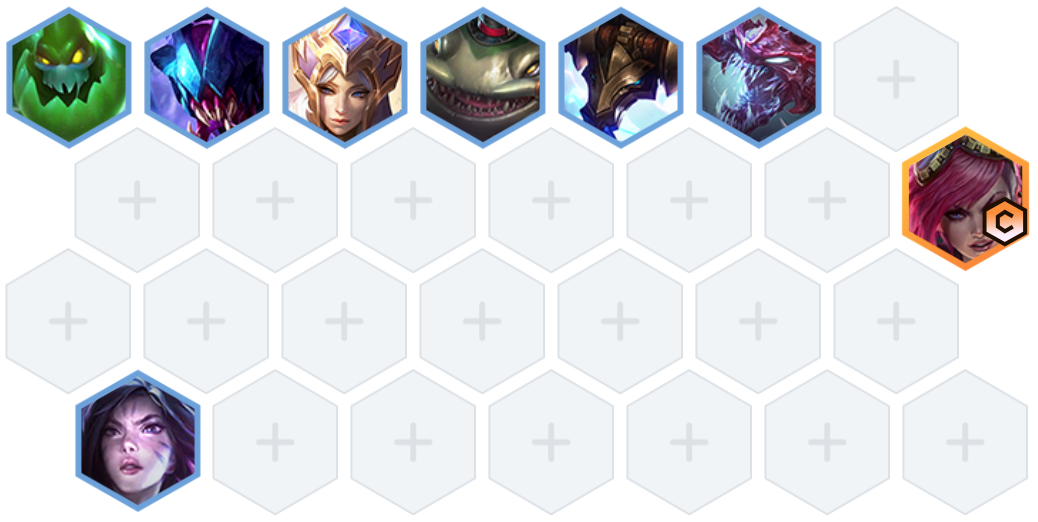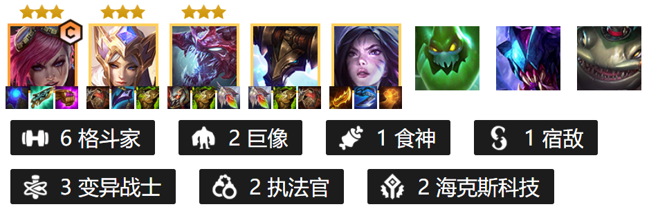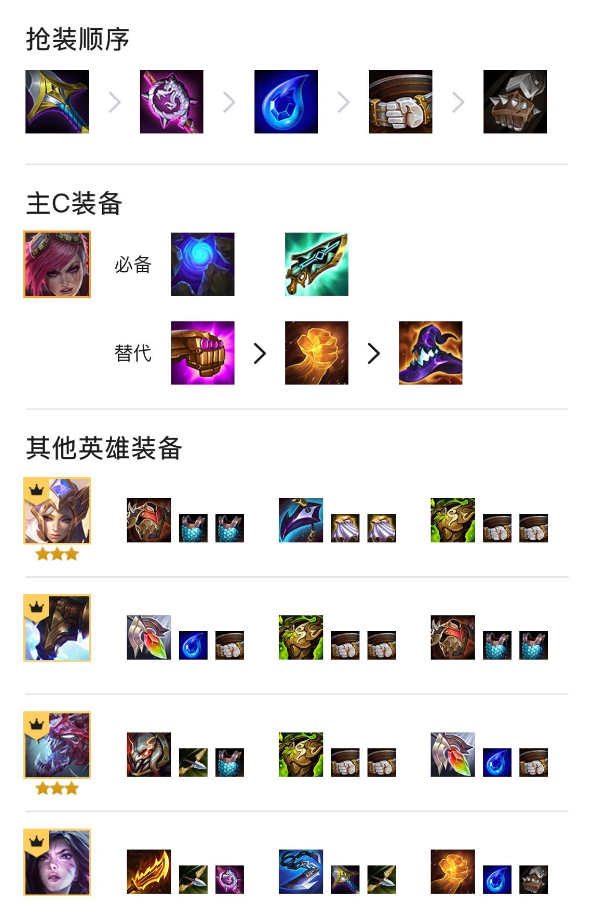 这个阵容八级成型九级大成,九级可以弥补伤害不足的短板,后期站位如图,这个站位是克制对面输出在左边的前期阵容。