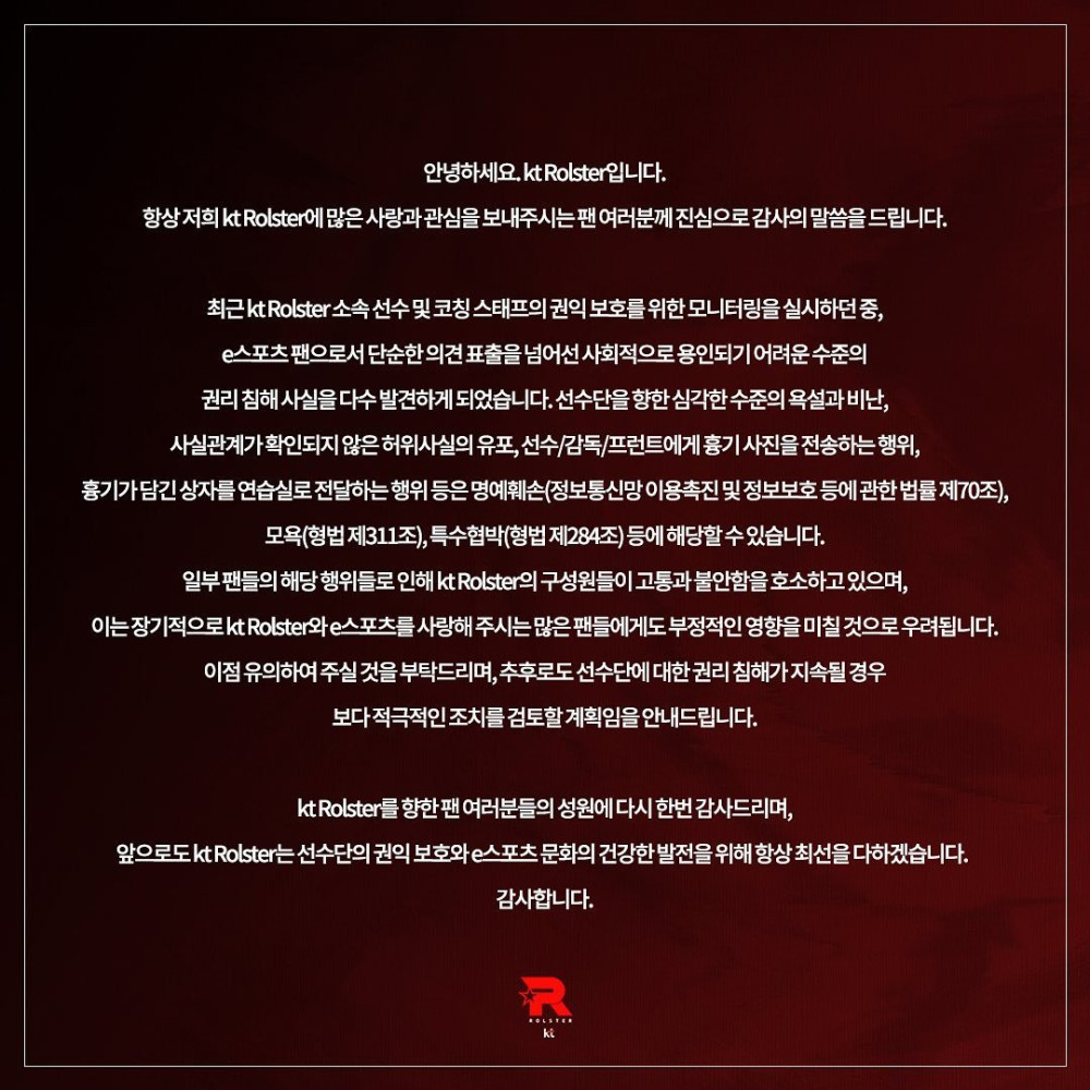 KT发布公告,对严重程度辱骂和指责选手、散布没有确认的虚假信息、向选手/教练/管理层发送凶器照片、将装有凶器的箱子送到训练基地等行为进行了严厉谴责,并表示今后将考虑采取更严厉的处理措施。