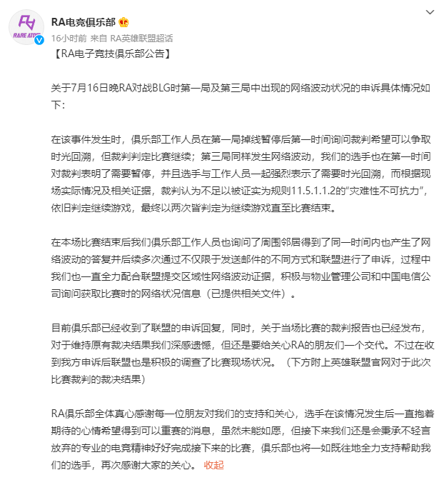RA发布公告,表示已收到申诉回复,此前对阵BLG时两度掉线的比赛将维持原判: