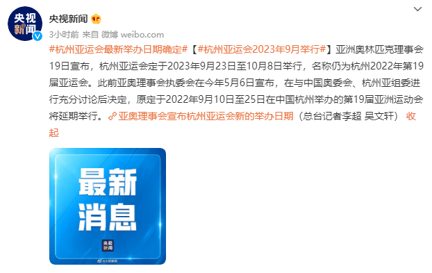 今年五月份时,原定于2022年9月10日~25日举办的杭州亚运会宣布延期。而在今天亚洲奥林匹克理事会宣布杭州亚运会将于2023年9月23日~10月8日恢复举办,名称仍为“杭州2022年第19届亚运会”。