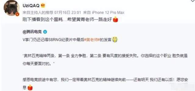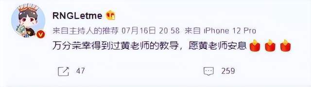 也是因为这两次合作,黄老师和俱乐部以及选手之间产生了很深的情谊,虽然后面没有再合作,但是这两次的合作给双方都是很好的反馈,他们也一直保持着联系,结果让人没想到的是,黄老师很久没有出现在电竞圈里,这一次出现居然是这样的噩耗,确实让人难以接受啊,希望他一路走好吧,对此你们有什么想说的吗?