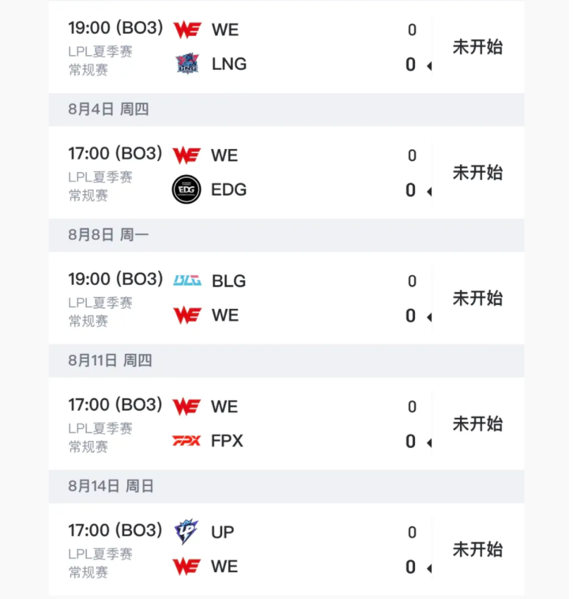WE后面还会遇到LNG、EDG、BLG、FPX和UP。这几支队伍里面,LNG和UP应该是有些机会的。他们最近的状态,都不是特别的好。所以WE可能真的有机会,也许不是今天,但相信后面WE努努力,还是可以冲击一下的,不知道大家如何看待呢?