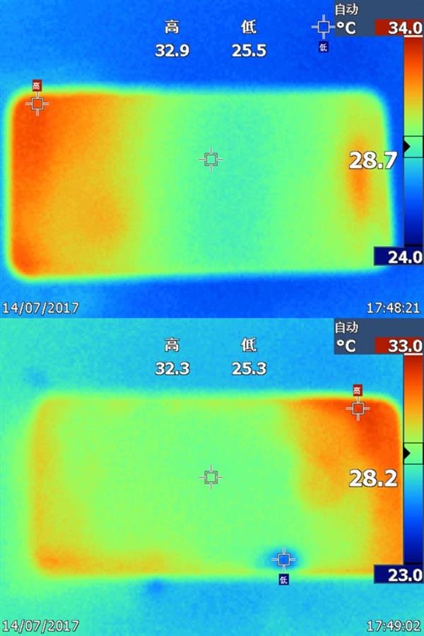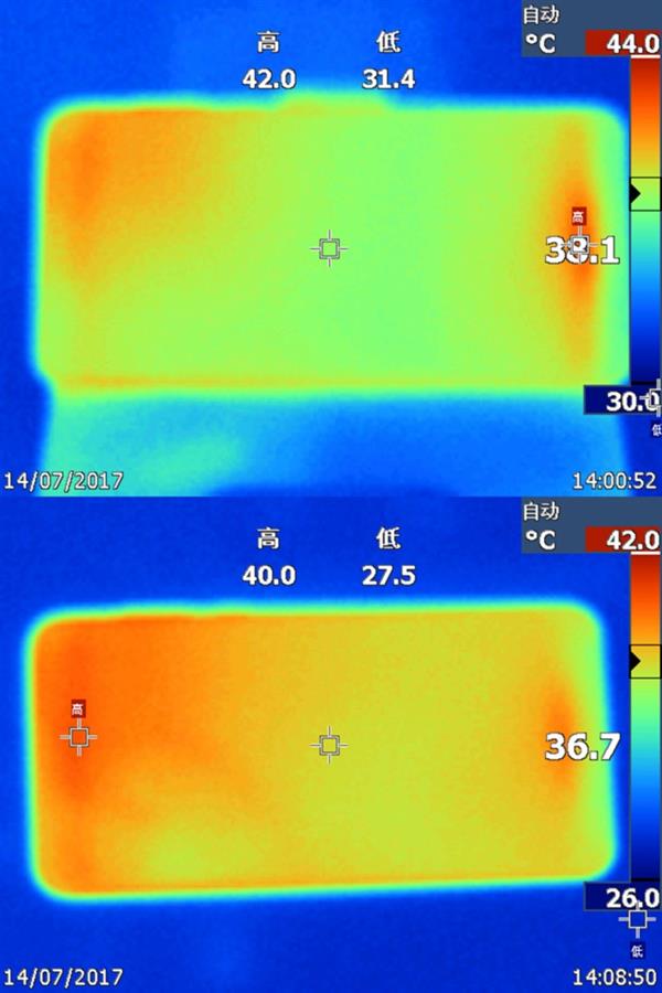 将石墨贴纸贴在手机手机背面之后,手机散热问题有了一定程度的改善。不得不说石墨的导热效果是很不错的,根据热成像图可以看到,背面的温度分布均匀,而且有一定程度的降低。