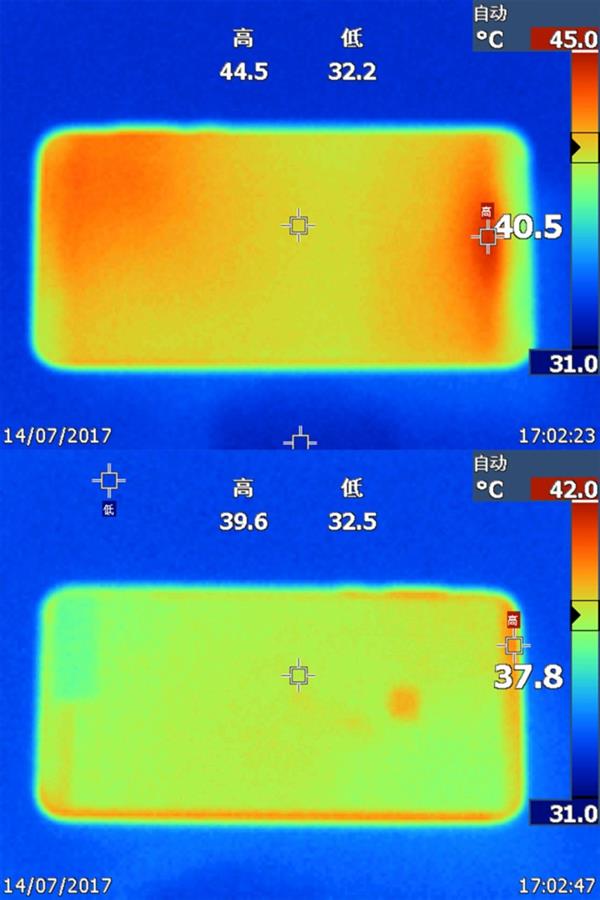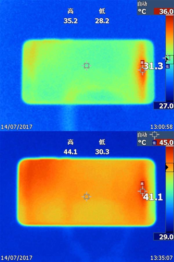 ↑↑↑手游前(左)后(右)手机温度上升明显