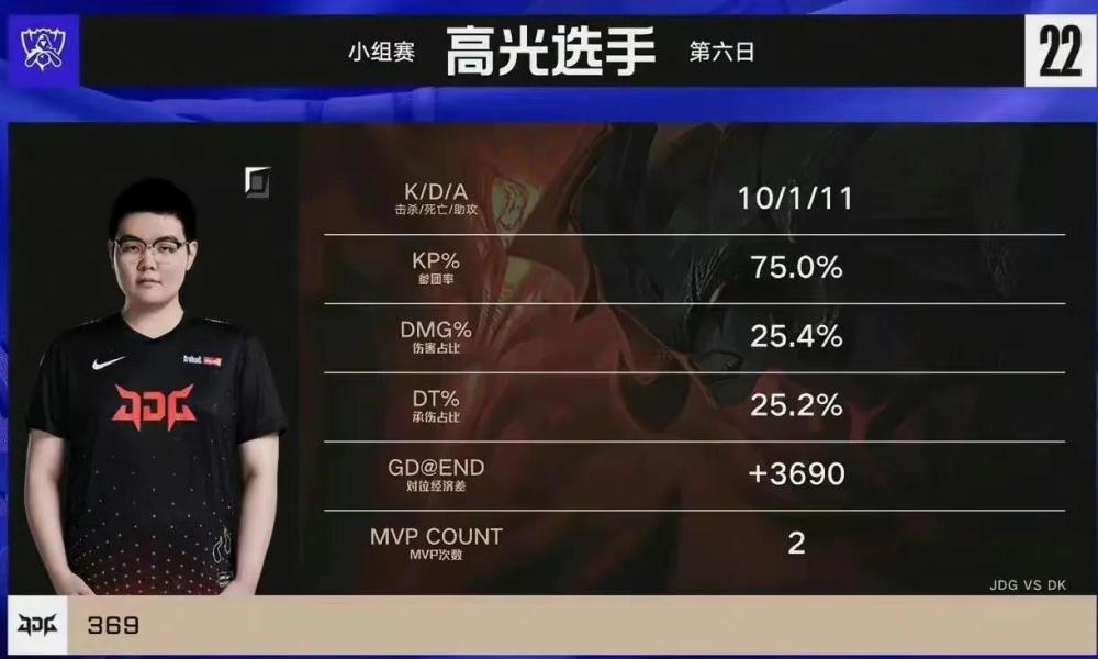 前言:S12赛季的比赛已经接近尾声了,相信绝大多数的玩家都关注了最近一段时间的对抗,世界赛小组赛第二轮进行的非常激烈,目前已经有四支战队成功晋级了淘汰赛。分别是edg战队,T1战队,jdg战队和dk战队。Jd g战队在这一次的比赛中发挥的非常出色,小组赛第二轮虽然没能拿到全胜的成绩,但是也是双杀了DK战队,尤其是上单选手369,在最后一场的比赛中,369的对位经济差图火了,直接领先Nuguri了十个369,丝毫没给DK战队任何机会。