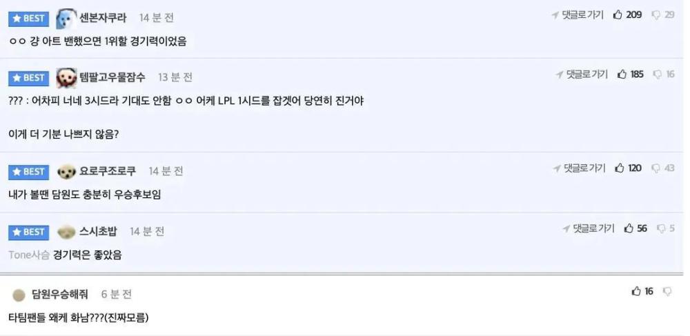 比赛结束之后,大量的韩国网友也是纷纷热议这场对决,在他们看来,dk战队在第轮的比赛中发挥的已经非常出色了。主要问题就出在了BP的思路上,加赛dk战队的阵容并没有选择的特别好。而一些lpl赛区的玩家也是调侃了起来,感谢tes战队送来的顶级上单999,不知道现在的tes战队到底作何感想,他们送出的选手都在赛场中有着非常不错的操作。感觉jd g战队在今年的对抗中很稳定,有机会去争夺一下荣誉。