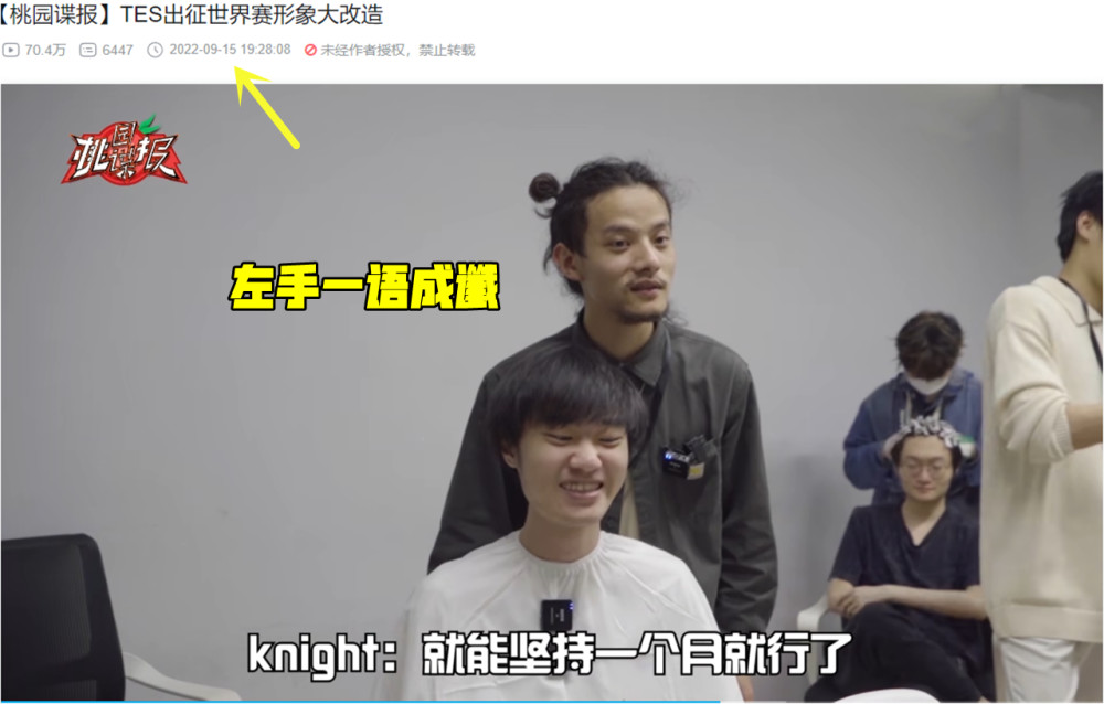 TES粉丝都知道,出征前山城小栗旬给所有选手剪头发,阿水还给自己染了一头红发,寓意一路红到底。小栗旬询问中单Knight有什么要求?Knight回复:能坚持一个月,世界赛够用就行,坚信一个月肯定打得完!谁知道Knight这番话一语成谶,视频发布当天是9月15号,TES是10月16号倒的,可能这就是顶级中单的预判,现在回头看有点心疼。