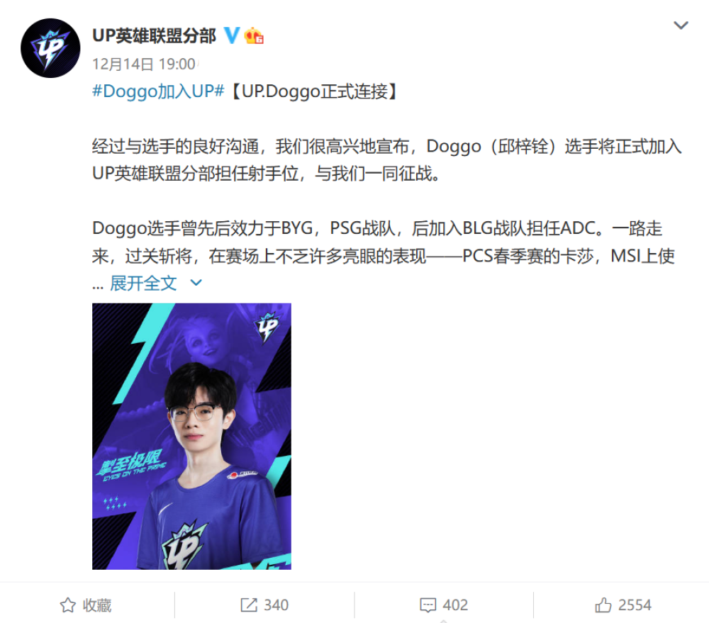 而在宣布了Ning和Baolan的加入之后,UP紧接着也公布了其他几人,而AD位置上,正是在上个赛季初引起了比较大争议的AD选手Doggo。说实话,其实Doggo在LPL的表现并不算太糟糕,甚至有时候要比焕烽强不少,但毕竟大家对于Uzi的期待太大,所以才会对Doggo的要求高了不少。