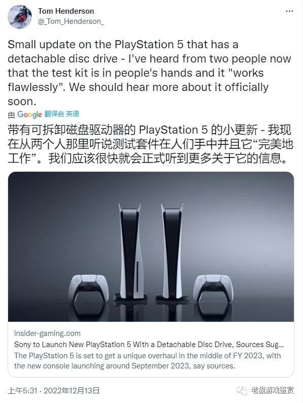 12 月 13 日消息,爆料人 Tom Henderson 表示,索尼正在开发小改款 PS5,目前新机已经处于测试中,并且可以“运行完美”,预计新款 PS5 将于 2023 年 9 月左右推出。