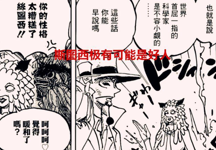 所以现在斯图西几乎是没有动过手,但现在有个问题就是,如果斯图西也是科学家,她所研究的方向是哪些?难道也是跟罗宾一样,专门研究历史正文的?斯图西的身份也太神奇了,如果不出意料的话,斯图西应该也会是某个国家的公主,而且她也需要复仇,所以她没有跟草帽团正面冲突,现在的她很高冷,后期可能跟波妮一个样。