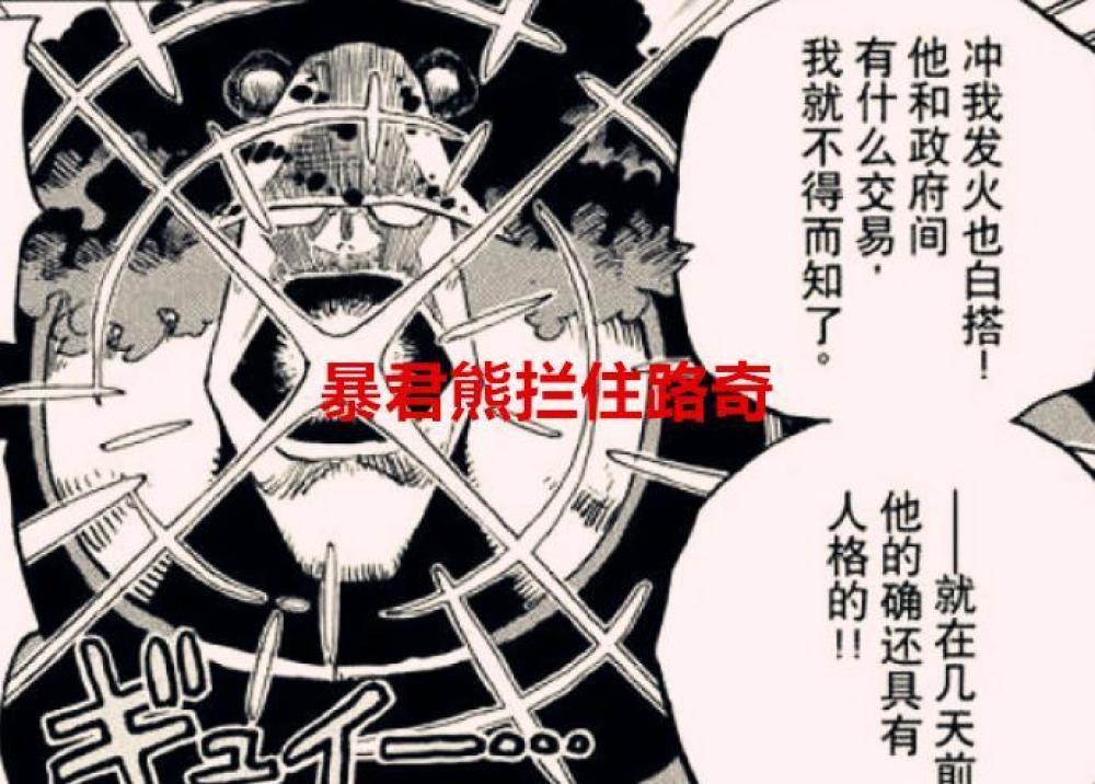 此外,不只是黄猿,暴君熊也出现了,他来到了蛋头岛,但却遇到了CP0这伙人,却没有看到波妮,路奇看到暴君熊也表示惊讶,因为路奇知道,暴君熊是被萨博救走才对,为什么又会出现在这里,而路奇的狼子野心又安耐不住了,他想要把暴君熊捉回去,给天龙人继续当坐骑,暴君熊显然是不愿意的,于是暴君熊出手,准备要拍飞路奇他们。