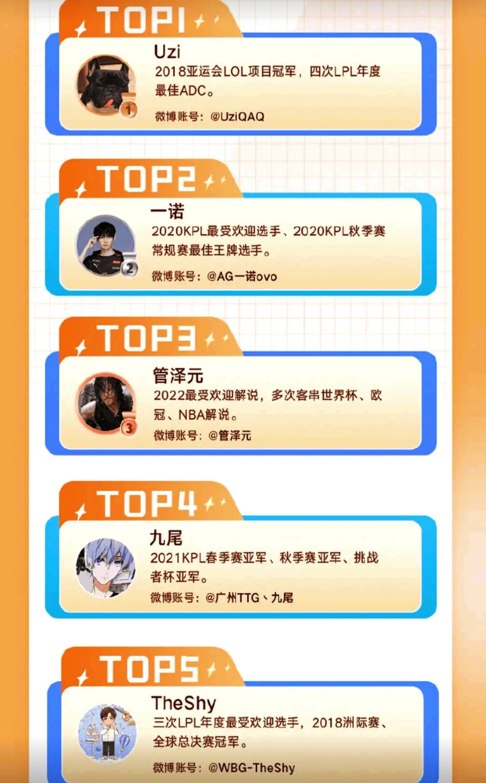在年度十大电竞选手当中,有四位选手是来自KPL赛区的,有六名选手是来自LPL赛区的,其中排名第一的是Uzi,虽然目前已经不再在场了,但是uzi的热度还是挺高的,其实在2022年也是经历了复出风波,而且还升级当爸爸,等等事情也是得到了圈内一众人士的祝福,使得uzi的热度依旧不减当年,即使不在赛场了,依旧是大家心目当中的英雄联盟LPL赛区的灵魂人物。管泽元就是排在第三名,在今年的解说比赛过程当中,我们也是看到了管泽元金句频出,作为一名职业解说的话还是特别到位的,专业度方面得到了广大观众朋友们的一致认可。Theshy则是排在第五名,但目前现役职业选手当中,Theshy也绝对算得上是其中热度最高的一位。