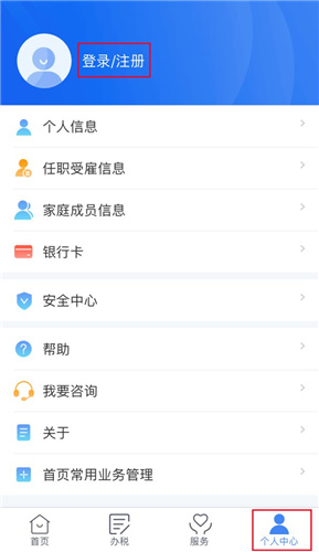 2、打开个人所得税首页,点击下方的【个人中心】-【登录注册】,进入后即可注册并登录;