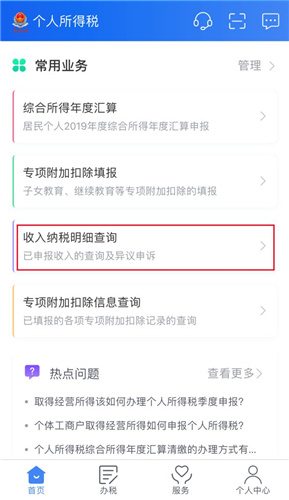 5、需要确认2020年度收入纳税的详情,点击【常用业务】-收入纳税明细查询,在这里可以查看到2020年度由:工资报酬、劳务报酬、稿酬、特许权使用费等所有的收入合计、以申报税额合计;