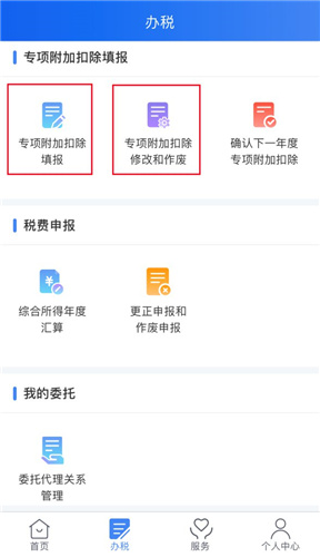 注意:如果需要填写或者修改附加扣除信息,可以点击【我要办税】-【专项附加扣除填报】或【专项附加扣除修改和作废】并选择2020年度,即可填写或者修改相关的信息。