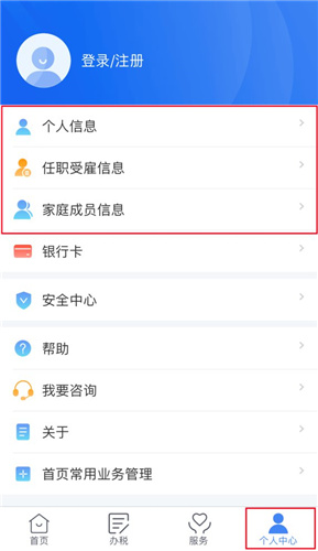 3、检查个人信息是否正确完善,点击【个人中心】即可看到,个人信息、任职受雇信息、家庭成员信息内容,需要将对应的基础信息补充完整或修改;