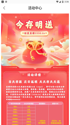直播间消费30元或者打码量50元(vip2),即可与您心仪的女神甜蜜互动天天现金大回馈,您的每一笔存款,都是对明天的投贵!初覆直播面世以来,承蒙广大会员信任与支持,现推出天天回馈活动,只要您当天在初夏直播[3350.tv】使用公司入款转殊充值方式存款总额达到一百元或以上,即可获得此项回馈彩金,每天最高可顿取88888元!