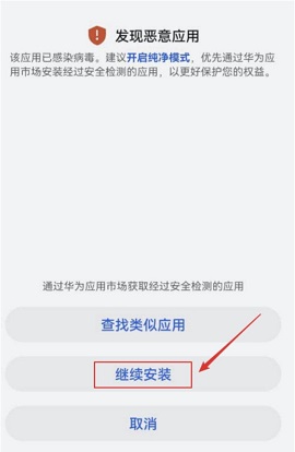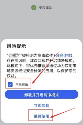 下载成功后,弹出‘发现恶意应用’对话框,选择‘不再提示’和‘继续使用’