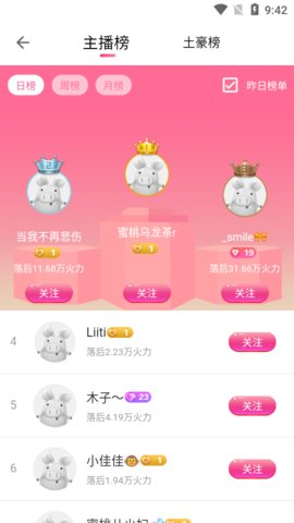 3、公正榜单:关注支持喜欢的女神主播登上周/月榜首宝座,人人都有机会登上富豪榜