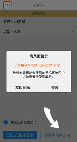 2、在「高风险提示」弹框出现后点击安装,如没有安装,请重復第一步并点击「忽略风险并安装」