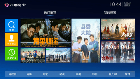 1、首页界面是板块类布局,主要是搜索、电影、电视剧以及设置等板块构成,非常简单