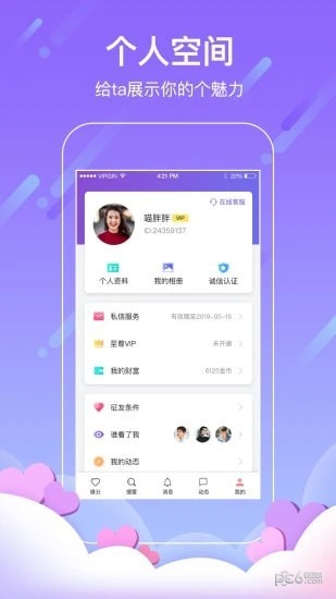 2.在我的页面,查看个人资料、我的相册、诚信认证、私信服务等