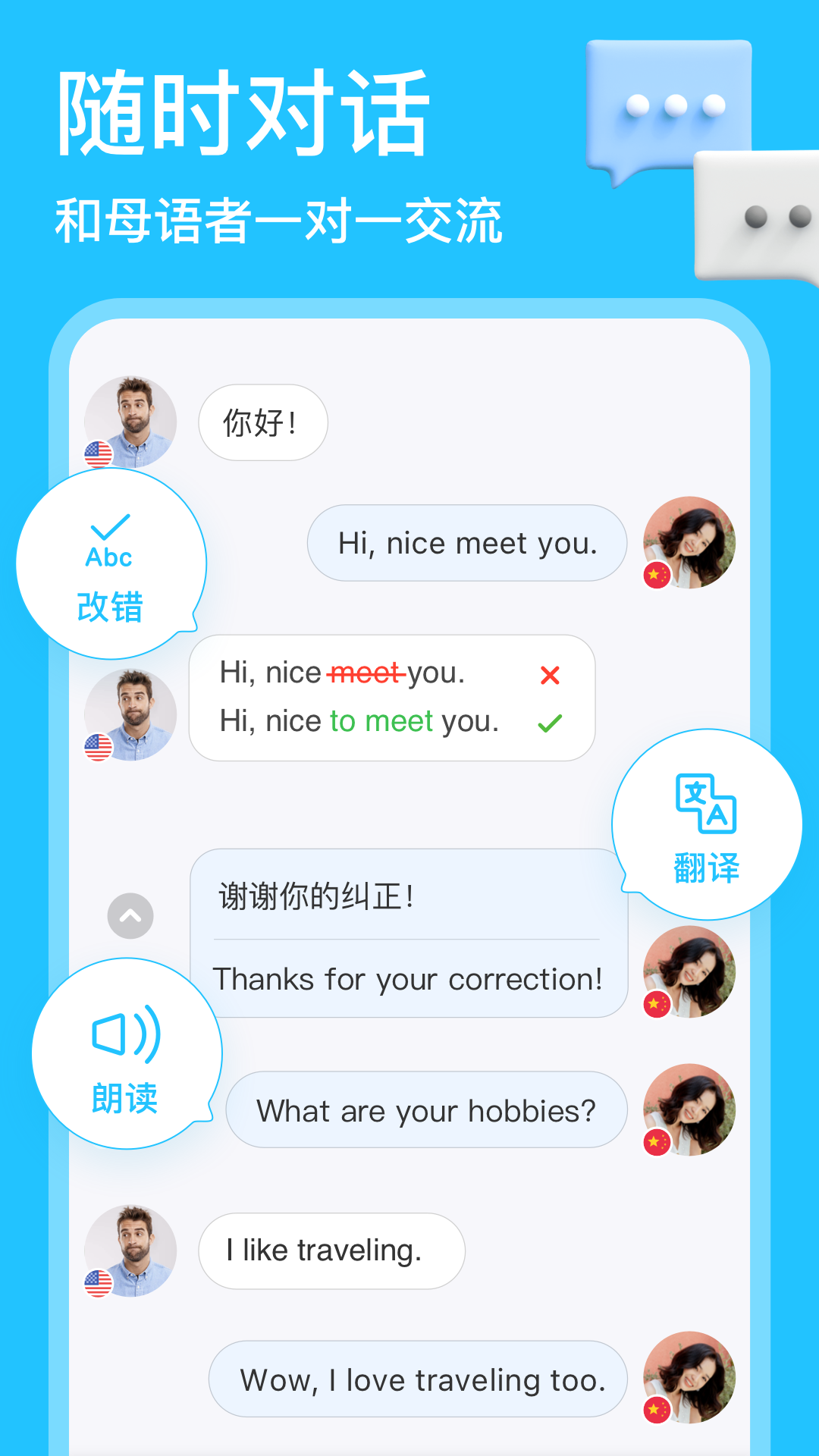 HelloTalk安卓版app内置翻译、发音、注音、改正等功能,让学习和聊天一样容易。