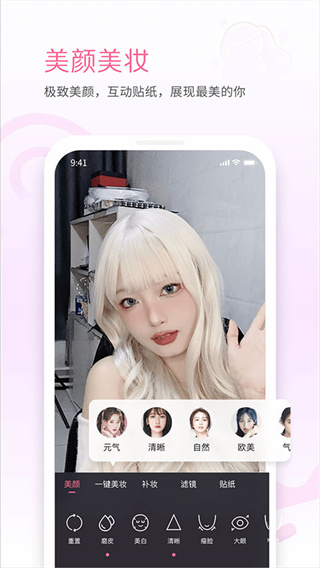 实时直播也能拥有最美颜值。新增5大功能,五官微整、一键美妆、细节补妆、美肤滤镜、互动贴纸,超100种美颜效果。为你的直播颜值保驾护航~