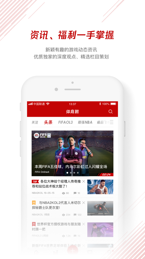 体育鹅是一款多功能的手机体育游戏软件,该应用让你可以随心所欲地进行下载。不仅包含了FIFA OL3等热门游戏,还能观看体育直播,更不可错过每天的球赛直播。用户只需绑定账号,即可随时查看球员信息、历史对局等详细内容。那就快来下载体验吧!