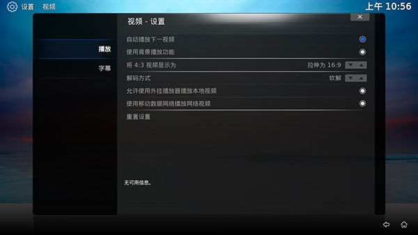 4、设置:支持自主设置解码方式、字幕、输出、插件扩展、Airplay/DLNA等功能