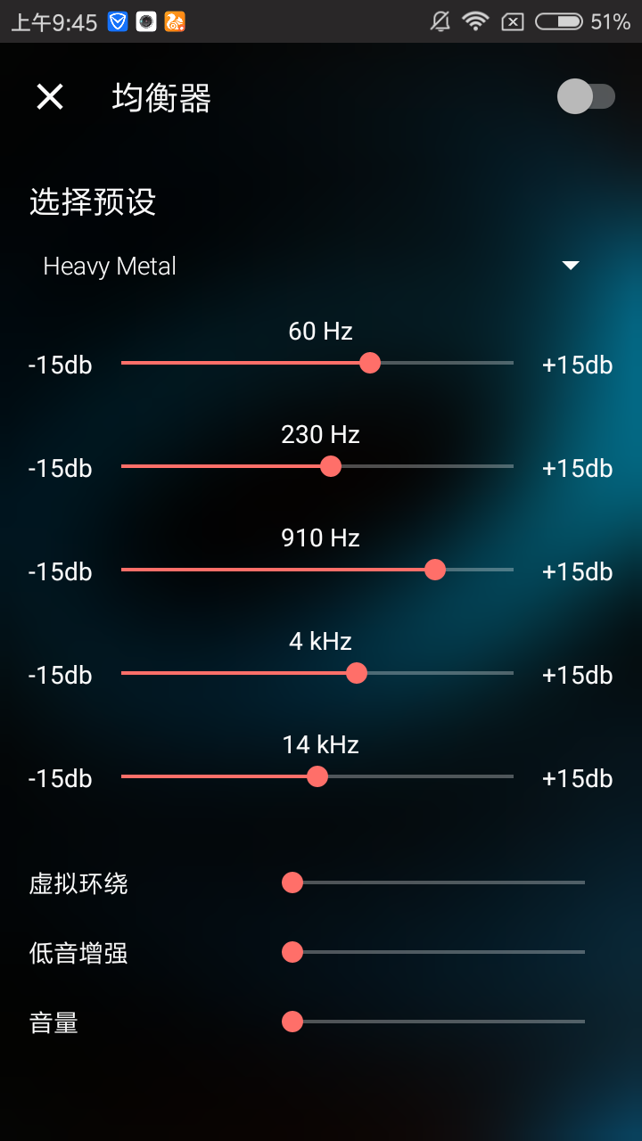 5、内置5频段均衡器,带低音增强,3D混响效果,虚拟器及10项极棒的预设