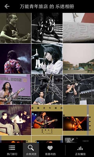 如果别人都在收听的曲目不能让你满意,分类浏览提供了搜索和按照音乐类型查看的功能,从这里,你能找到所有入驻豆瓣的音乐人。如果你注册过豆瓣并且通过“喜欢”收藏了一些音乐人,只要在“我喜欢的”标签中登录豆瓣帐号,就可以找到这些老相识。