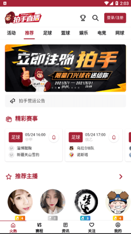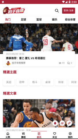 拍手直播是款体育赛事资讯直播软件,足球、篮球、网球和羽毛球等体育赛事的高清直播,这里有实时更新的足篮球比分,及时获取第一手比赛结果,查看国内外各类体育赛事的相关信息。