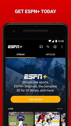 注册ESPN+以访问流媒体服务,该服务提供由世界上最好的联赛提供的体育赛事,以及高质量的文章和幻想工具。获取UFC、MLS、NHL、国际足球、大学体育等的现场活动。在ESPN应用程序中享受完整的30个图书馆和独家ESPN+原创节目,包括体育名人,包括佩顿·曼宁、达娜·怀特、凯文·杜兰特、亚历克斯·摩根等。