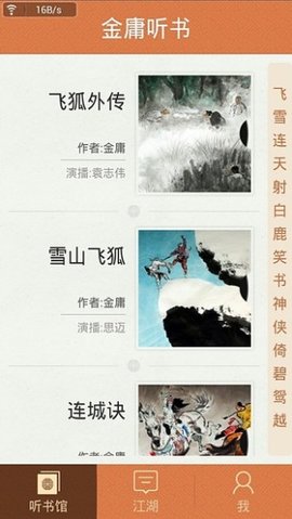 金庸听书App是一款非常实用的手机听力软件。该软件涵盖了金庸先生的许多作品,并由专业音频小说表演者阅读。要听金庸的武术,只有“金庸听书”。为了让您在观看时享受听觉神经的触感,特别是对于金庸迷来说,您一定不要错过这个软件。