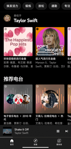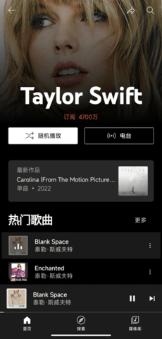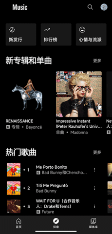 4.顶部标签包含艺术家、专辑、歌曲和播放列表。