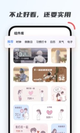 1、这里有许多不同类型的精美小部件:倒计时日、桌面时钟、天气、日历、句子引用、每日时钟和其他有趣且好看的小部件。