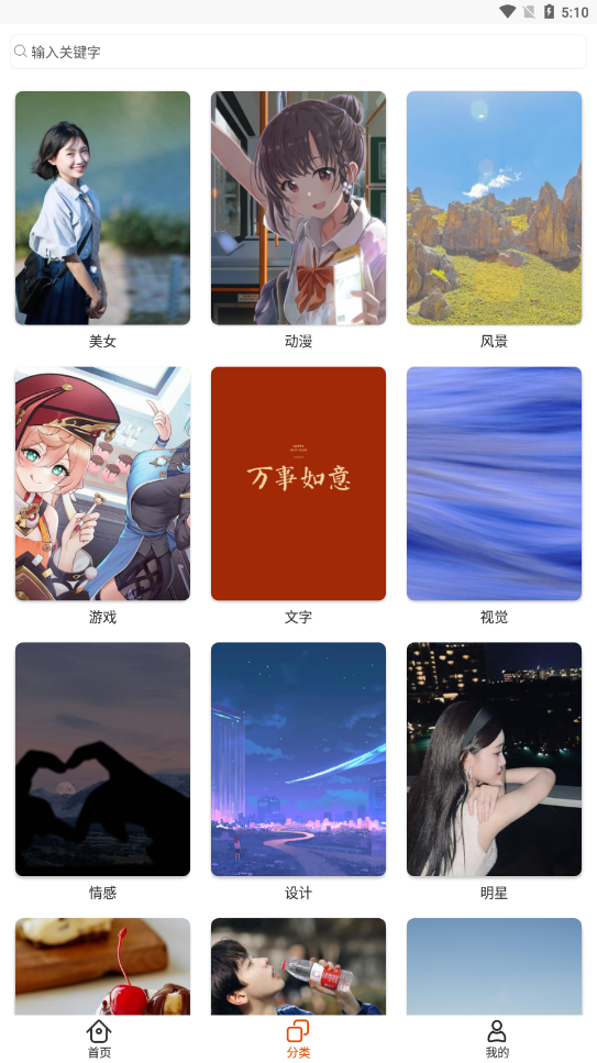 3、动漫、游戏、明星、风景、世界杯、花卉、建筑、星空、沙漠、海洋、可爱宠物、美食等多种品类免费订阅。