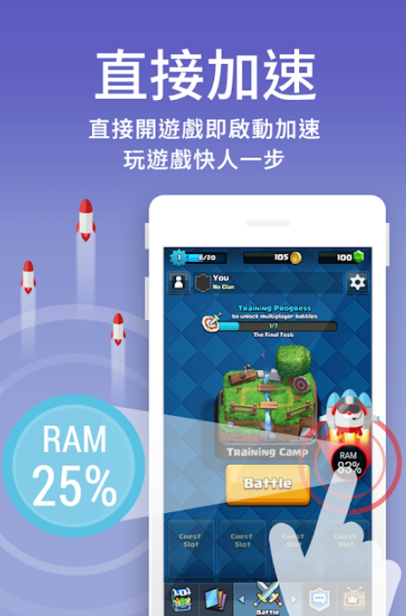 1、进入加速达人之后,只需要一键按下要玩的游戏,立刻进入加速模式。使用云端加速功能并优化手机记忆体,平均帮每支手机加速1.2倍,玩手游速度明显顺畅!