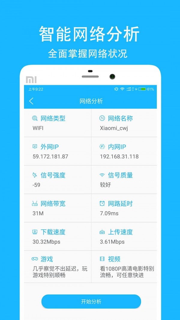 2.智能分析当前网络状况IP、信号、带宽、延时、下载、上传等数据