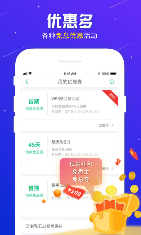 1、提供多种不同的优惠券,有首期借款免息优惠券,还有都少时间段内免息的借款优惠券;