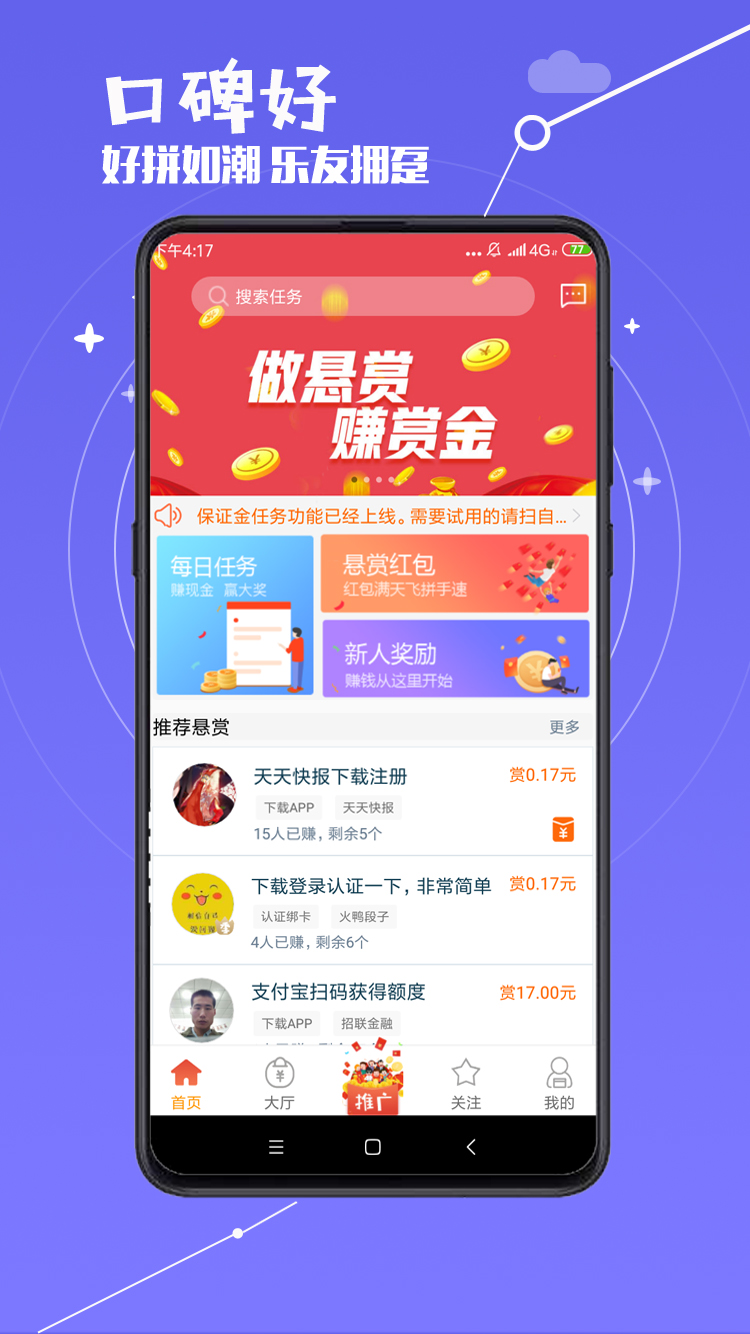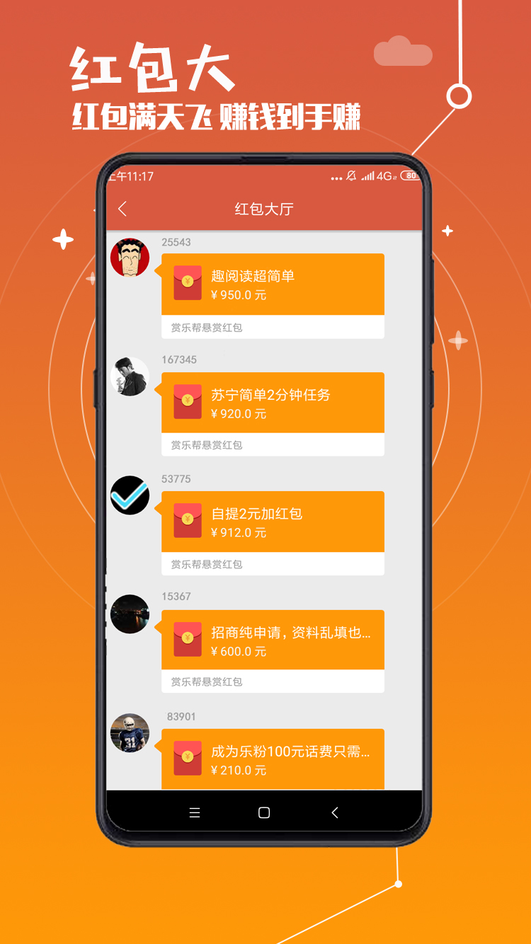 赏乐帮作为网赚兼职平台,赚钱游戏、阅读赚钱、分享赚钱、转发赚钱、红包赚钱、走路赚钱、试玩赚钱、打字赚钱、手机兼职、线上兼职等服务的赚钱平台;学生赚钱、宝妈赚钱可以看有 趣头条赚钱,看头条新闻赚钱,试玩赚钱游戏,做任务赚钱,现金红包助手,应用试客赚钱等,完成赏乐帮app下载,马上赚钱。