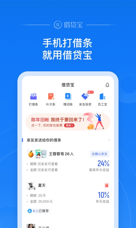 单向匿名:完成借贷宝app下载新版本安装,可以实名借款,匿名出借,免除尴尬,把控风险;