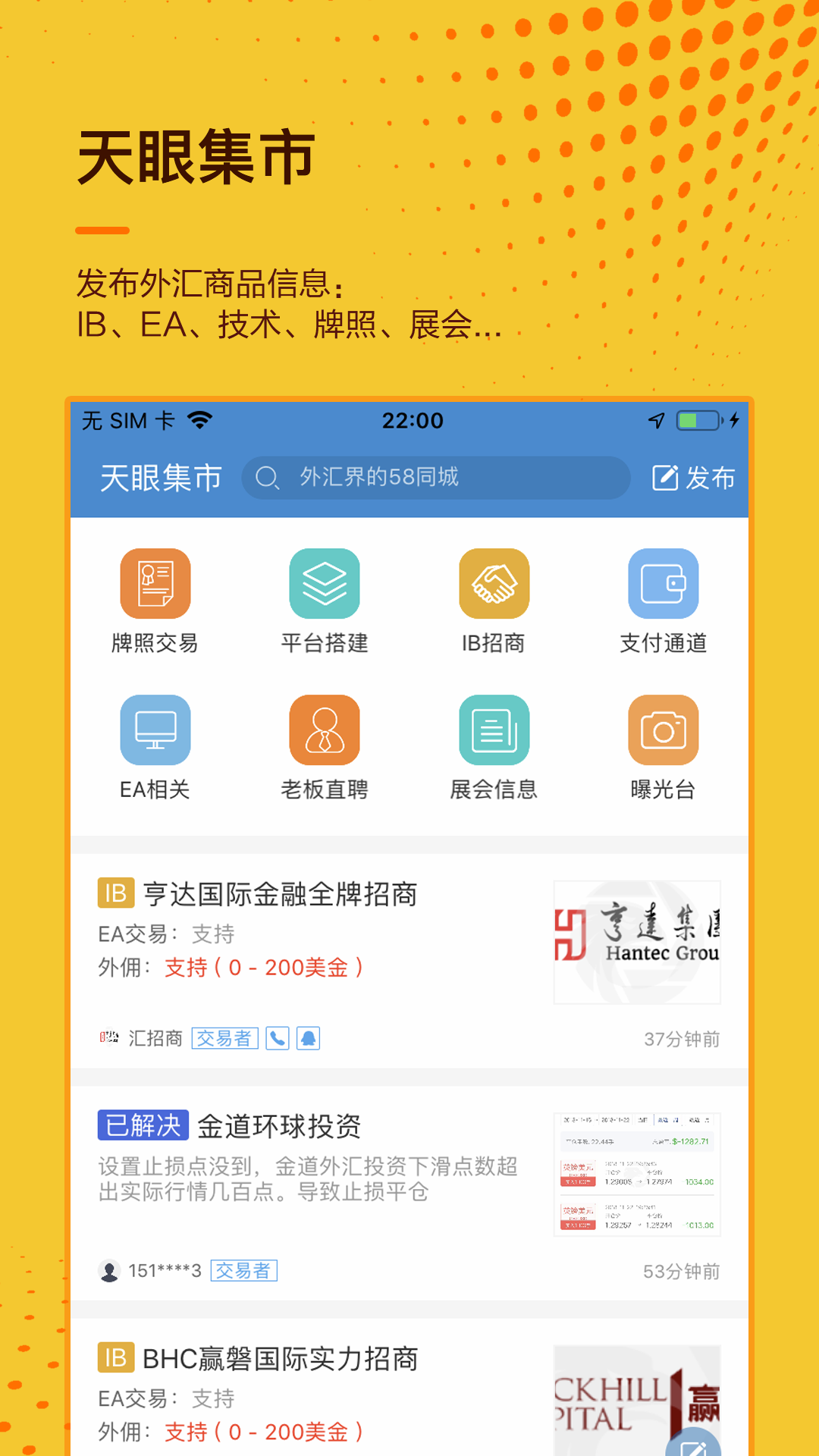 - 天眼集市:无限连接外汇界的各类需求,倾力打造黑平台曝光、牌照流通、平台搭建、技术合作、展会发布、团队招聘、EA构建等第三方服务平台