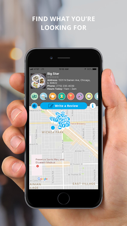 在用户驱动的评论和基于地图的界面之间,我们的应用程序为你提供了一种创新的方式来发现什么对你来说是重要的。想找一家现在还亮着灯的夜总会?或者你是在寻找一家提供廉价饮料、凉爽氛围和优质服务的潜水酒吧?你可以缩小搜索范围,找到你想要的结果。