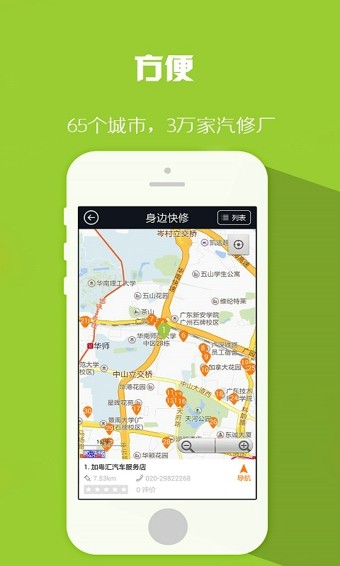 身边快修店:覆盖全国65个二线以上城市的25286家修理厂,数量还在逐步扩大中。专业商户评级、客户评价、服务及活动介绍,一键导航使您爱车保养修理不再犯愁。