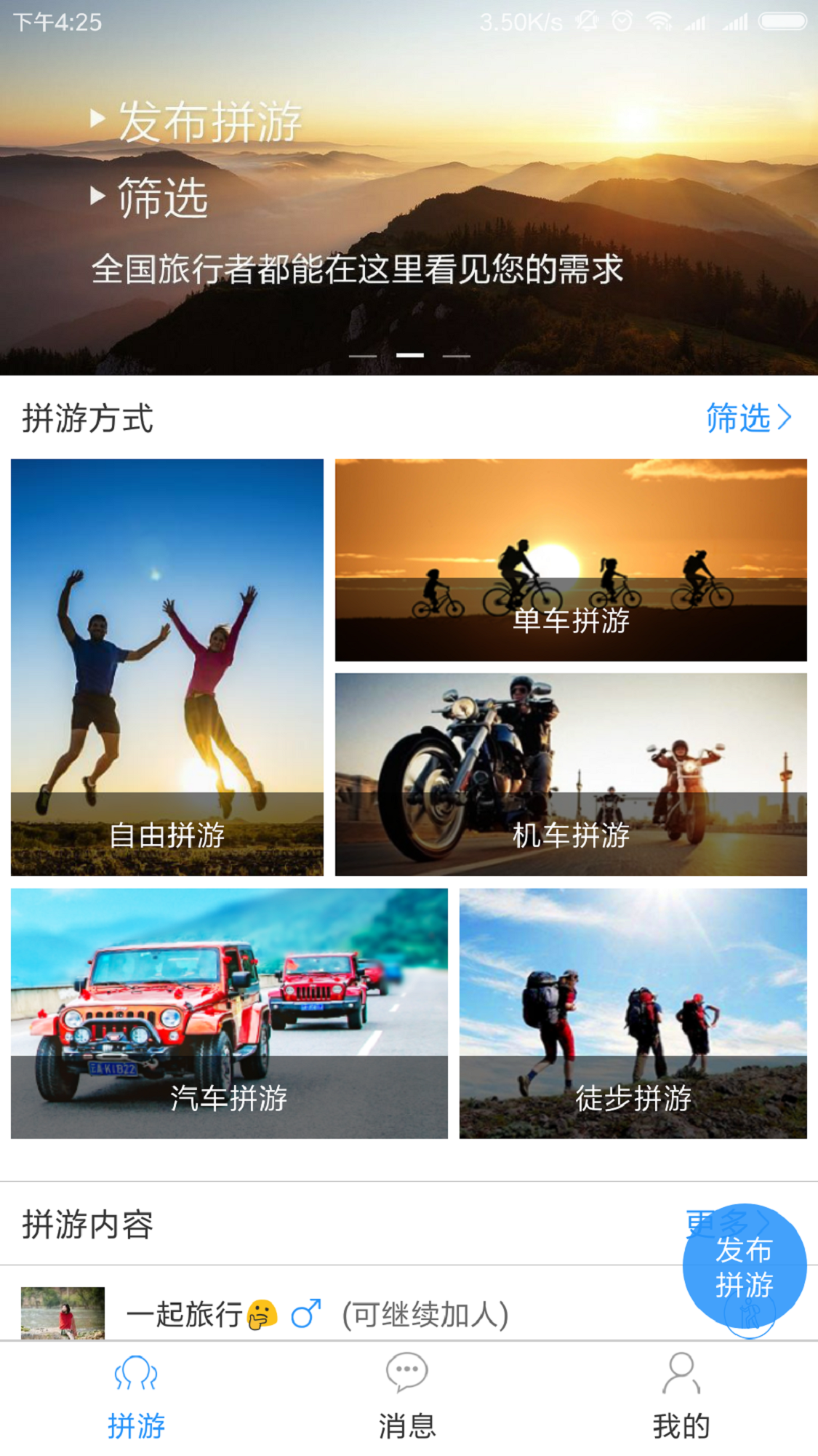 拼游下载最新版本网址,拼游让用户可在线发布个人行程召集驴友一同出行,也可在线找寻想去的路线,加入其它用户的出行队伍,让你同行路上找到更多志同道合的好友一同出行,减少旅游成本,看到更多精美风景,磨炼个人意志,更有达人推荐各种专业路线,让你找到更多实用旅游方案,喜欢的小伙伴快来最火软件网站下载吧!